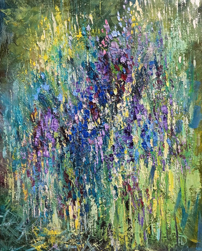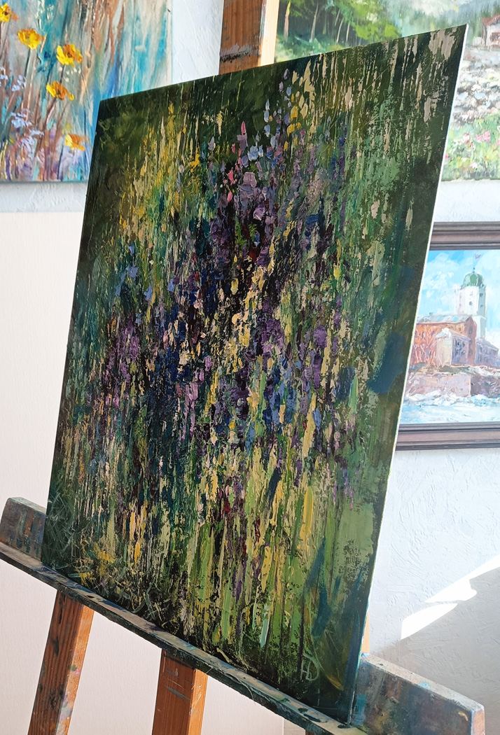 Ощутите дыхание весны с картиной маслом "50 оттенков зеленого". Эта уникальная работа, выполненная в смешанной технике с использованием кисти, мастихина и процарапывания, переносит зрителя в самое сердце весенней степи, наполненной ароматами приближающегося лета.
