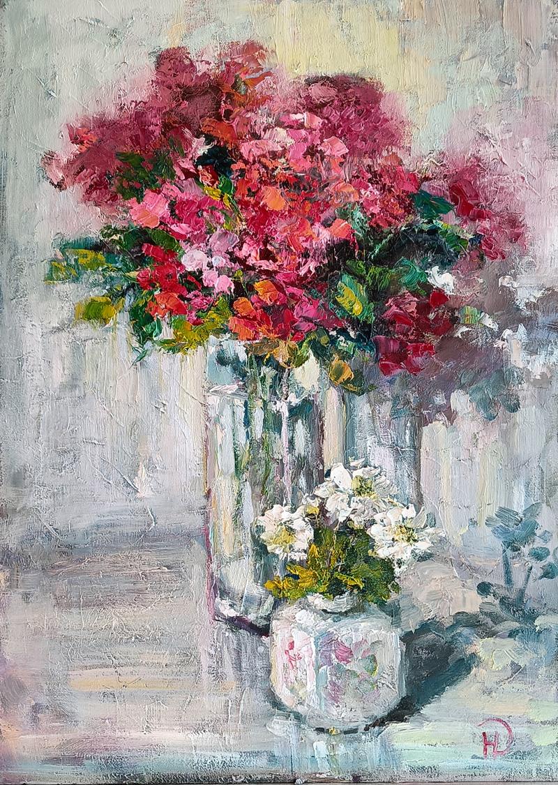Яркие, малиново-красные цветы в прозрачной и белые хризантемы в небольшой керамической вазе, все вместе, создают эмоциональную атмосферу на картине "Красное и белое". Настоящий цветочный аромат нежности переполняет воздух. Солнечные лучи проникают сквозь окно и озаряют букеты, придавая им ещё большую яркость и красоту. Контрастные мазки кисти художника насыщены цветом и энергией, создают ощущение лёгкости, наполненности позитивом. Тени, кажущиеся живыми и подвижными, добавляют глубину и объем. Рельефная поверхность изображения придает ему особую реалистичность, словно можно потрогать каждый лепесток кончиками пальцев, а с разных ракурсов можно заметить новые детали и нюансы не замеченные ранее. Все это создает ощущение полного погружения в мир цветов.