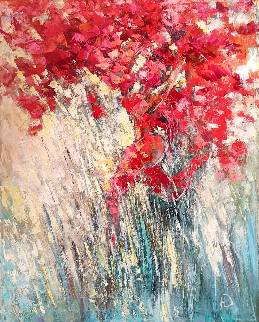 Окунитесь в мир ярких красок и неудержимой энергии с картиной маслом "Роза Плетистая". Этот завораживающий холст притягивает взгляд обилием красных оттенков, в которых словно танцуют тысячи бабочек, собравшихся вместе. Среди пышного цветения плетистой розы угадывается женский силуэт, застывший в вихре страстного танца.
