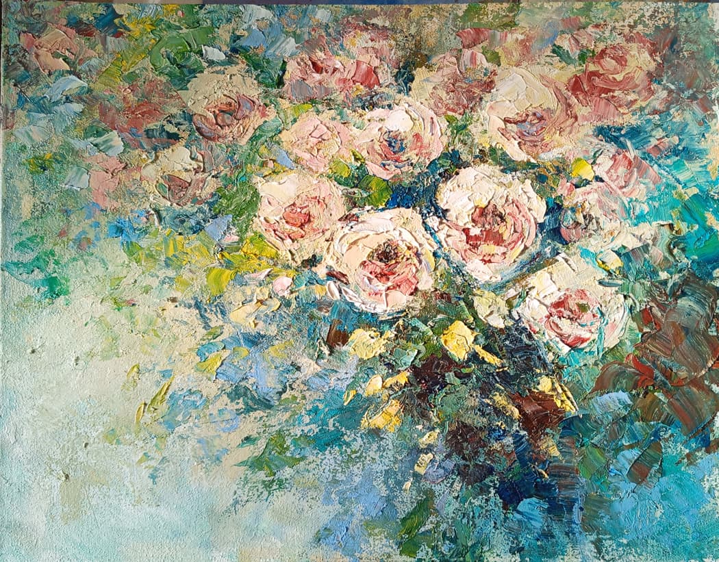 Картина «Розарий» — это истинный шедевр импрессионизма, который очаровывает зрителя своим трогательным изображением роз сливочной окраски. Эти нежные цветы, словно олицетворение любви и романтики, утопают в фоне зелени изумрудных, бирюзовых и салатовых оттенков, создавая атмосферу тепла и уюта.