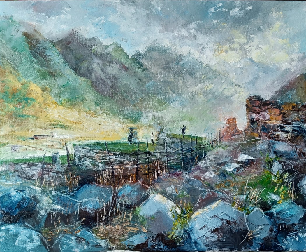Пейзаж северной Осетии на картине маслом завораживает своей суровой красотой. Солнце, выглянувшее из-за горной гряды залило ярким светом долину между горных красавцев. Скалистые хребты укутаны лёгкой дымкой, словно воздушным покрывалом. На их фоне две человеческие фигурки кажутся такими маленькими и беззащитными. Они стоят на, покрытых травой, крышах каменных жилищ горцев. Дома на склонах гор уже давно опустели и сюда поднимаются в основном туристы, чтобы насладить открывающимся пере ними видом на ущелье. Глядя на этот сюжет, появляется желание попасть в это место, встать повыше, раскинуть руки, как крылья и вздохнуть наичистейший воздух.