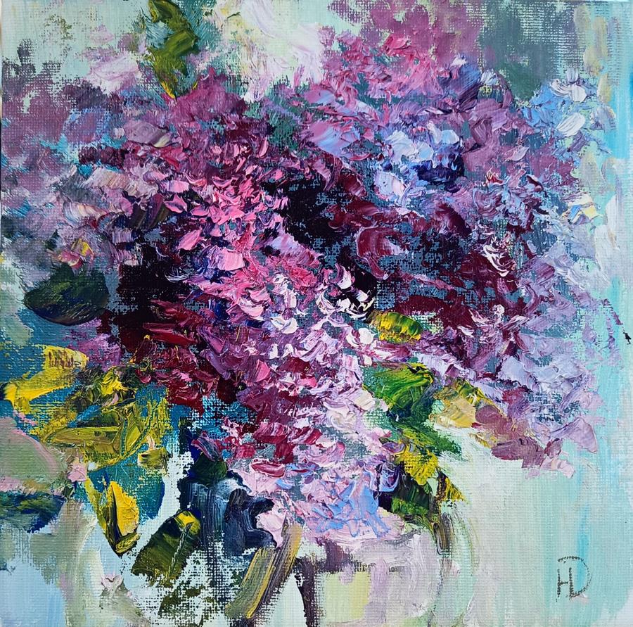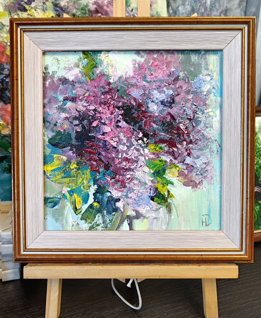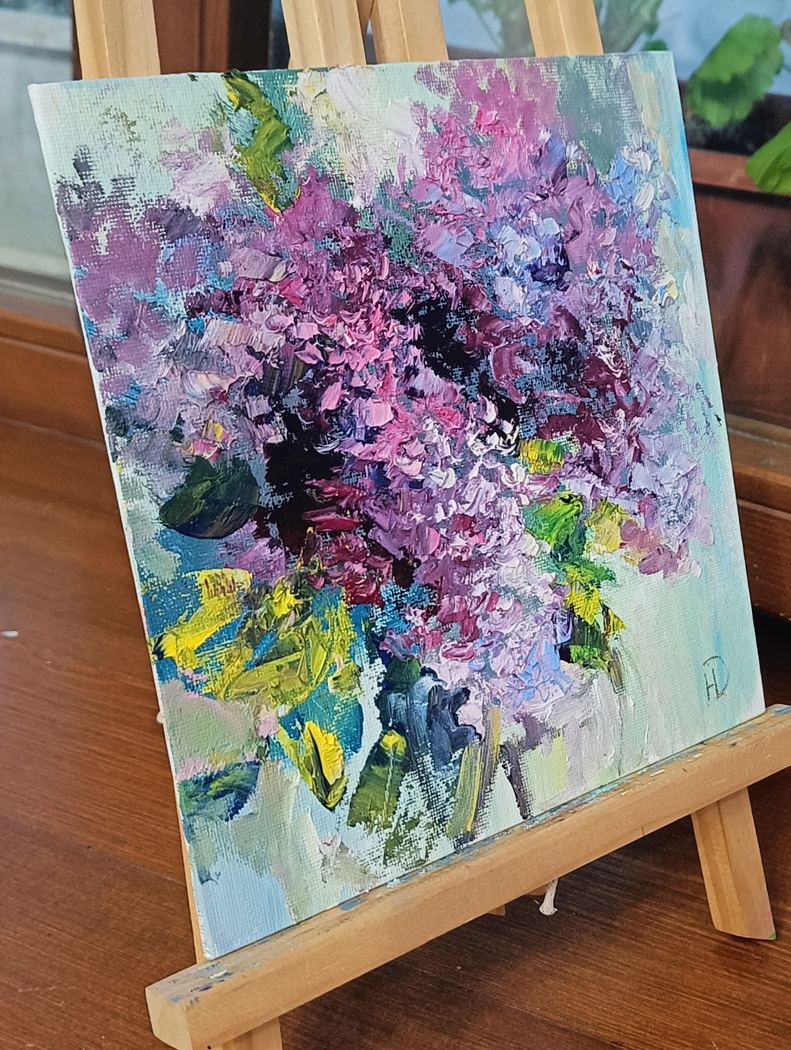 Богатство оттенков сиреневого — от нежного лавандового до глубокого фиолетового — создаёт завораживающий объём и глубину. Эти переливы цвета наполняют изображение живым светом, оживляя каждый лепесток. Несмотря на скромные размеры полотна, оно мастерски передаёт всеми любимую атмосферу весеннего пробуждения, безмятежное ожидание тепла и цветения.