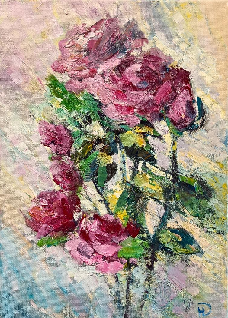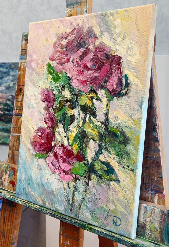 На полотне изображен нежный букетик роз, укутанный мягким светом, который словно тонкая вуаль обвивает цветочные лепестки. Эта игра света и тени, отражающая красоту природы, сразу же привлекает взгляд и создает атмосферу уюта. Любой, кто окажется рядом с «Солнечной вуалью», почувствует, как его настроение поднимается на более высокую ступень.