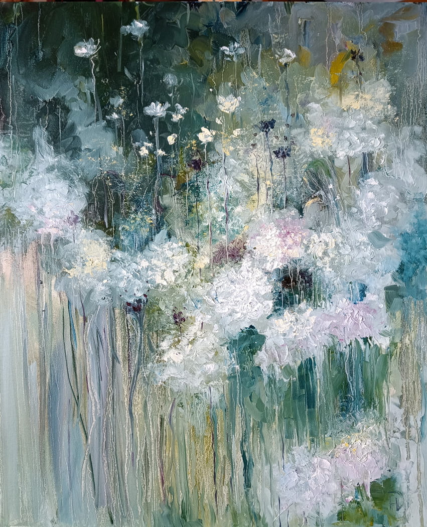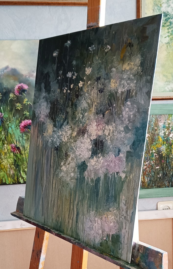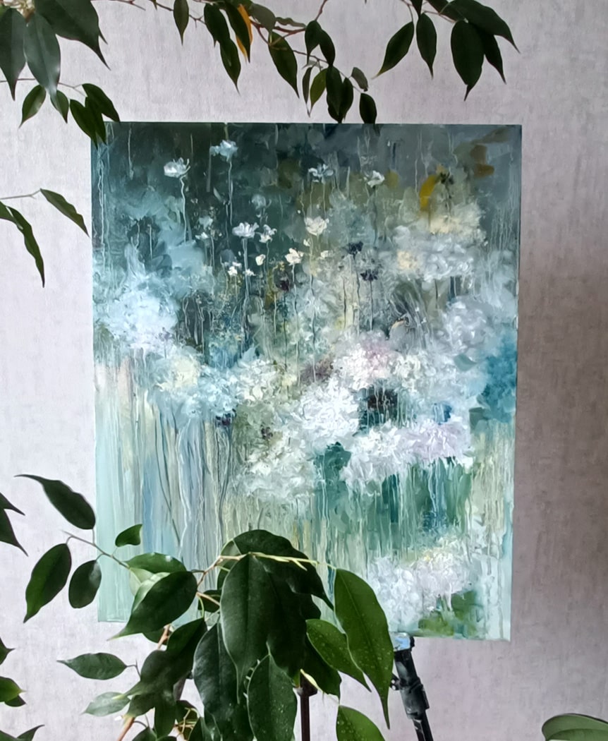 Погрузитесь в мир грёз и спокойствия с интерьерной картиной маслом "Сон среди цветов". Эта завораживающая работа, выполненная в успокаивающей сине-зелёной цветовой гамме, станет изысканным акцентом в вашем доме и перенесёт в мир фантазий и умиротворения.