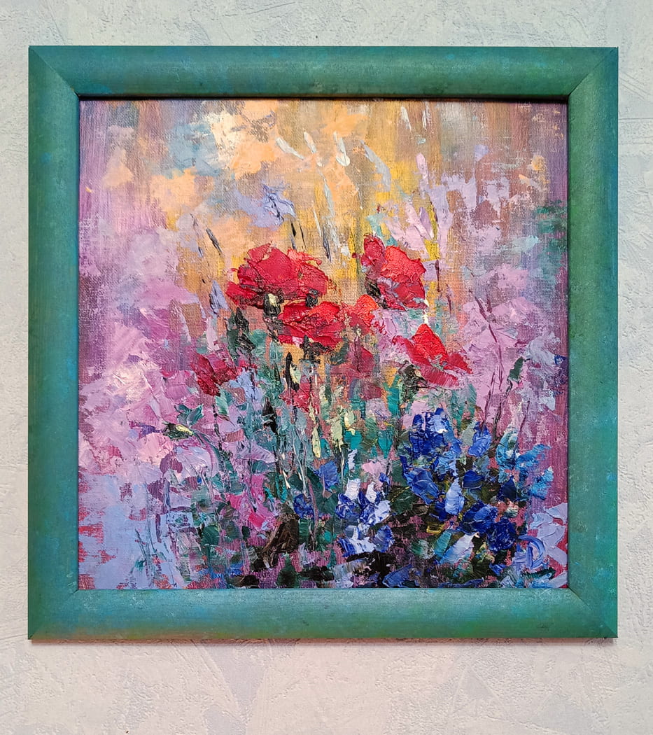 На картине доминируют красные маки, которые сквозь абстрактный фон с сложными сиреневыми оттенками выделяются особой выразительностью. Эти символичные цветы, стоящие на тонких высоких ножках, словно танцуют в окружении разнообразной растительности, окрашенной в бирюзовые, синие и голубые тона. Такой контраст создает ощущение движения и легкости, позволяя зрителю погрузиться в атмосферу радости и вдохновения.