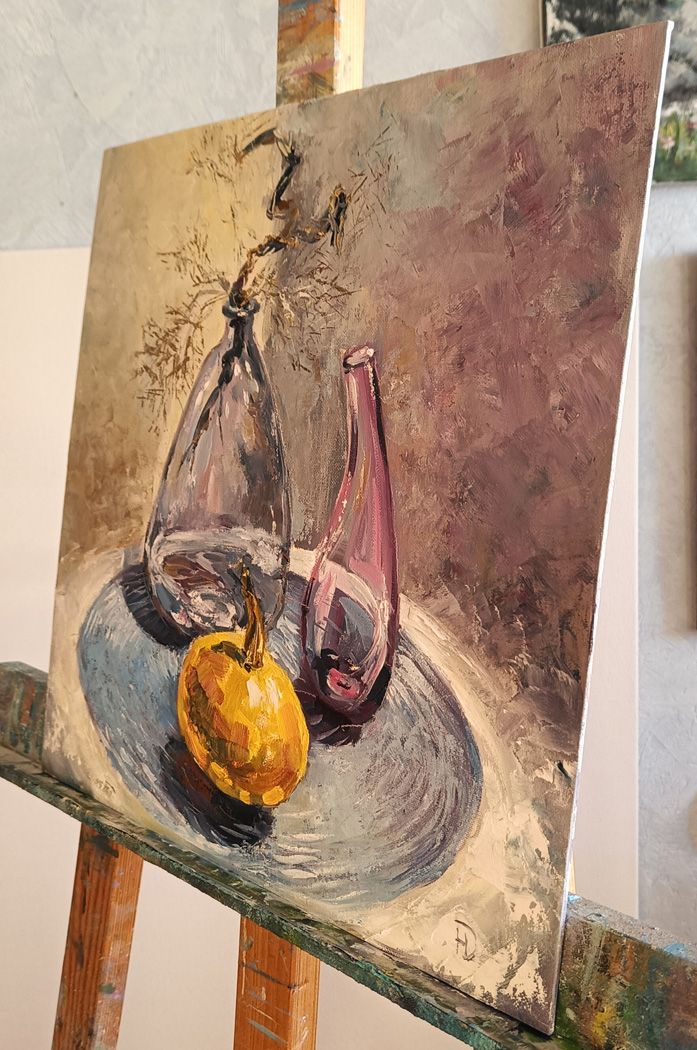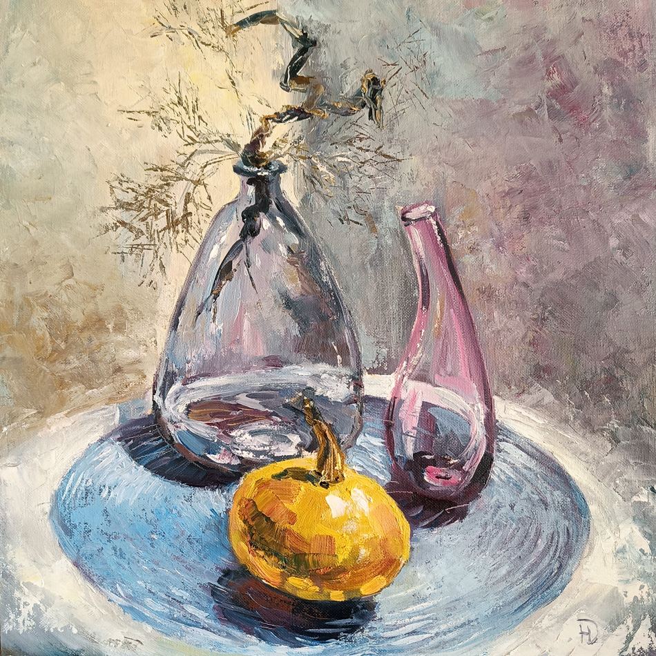 Окунитесь в атмосферу уюта с картиной маслом "Трио зимнего вечера". Этот очаровательный натюрморт перенесет вас в тихий зимний вечер, наполненный теплом и гармонией. На полотне искусно изображена композиция из трех предметов: двух стеклянных ваз и декоративной тыквы, расположенных на круглой синей салфетке.