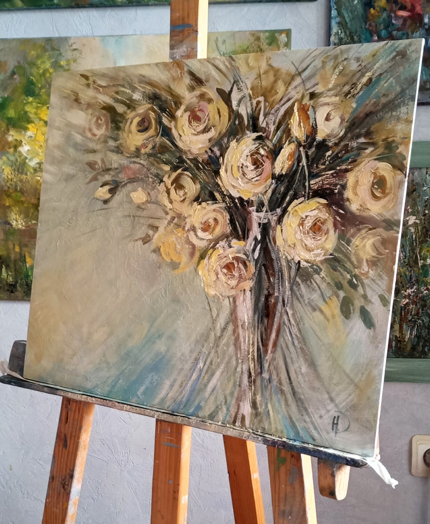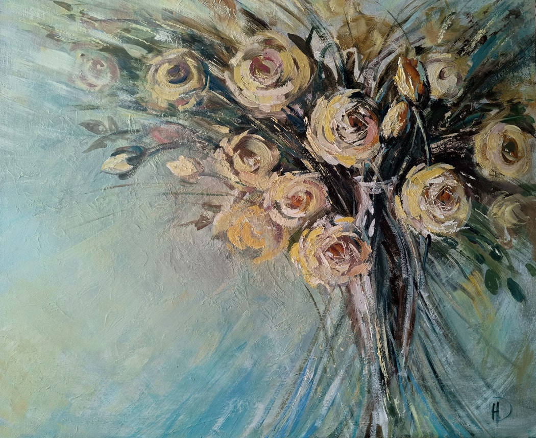 Погрузитесь в мир нежности и гармонии с картиной маслом «В вальсе». Это произведение искусства словно переносит зрителя в лёгкий, воздушный танец, где главные герои — нежные розы, застывшие в изящном движении. Их лепестки, окрашенные в кремовые и бирюзовые оттенки, будто кружатся в вальсе, создавая ощущение лёгкости и романтики.