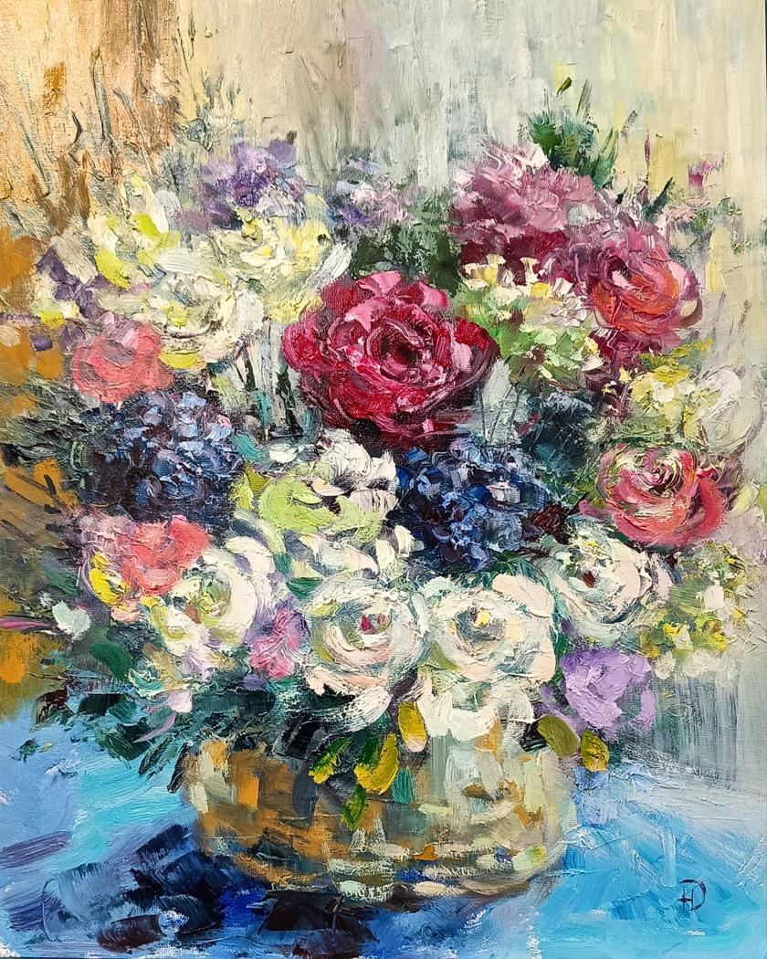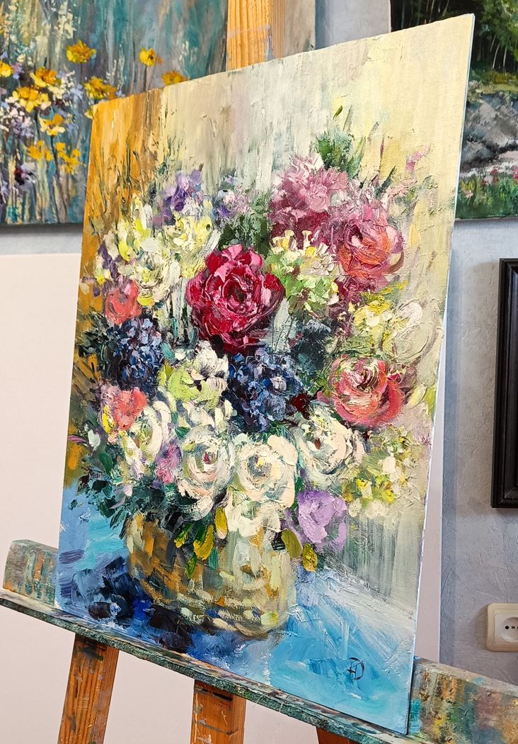 Композиция разместилась у солнечного окна, создавая ощущение тепла и уюта. Голубая скатерть, служащая фоном, добавляет работе еще больше света и оптимизма, подчеркивая свежесть и яркость цветочной композиции. Кажется, будто сама природа запечатлена на этом полотне.