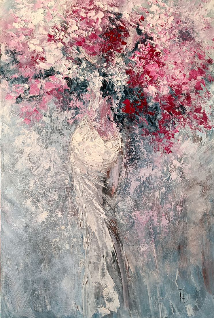 Погрузитесь в мир грёз с картиной маслом "Затерявшаяся в цветах". Эта завораживающая работа притягивает взгляд, заставляя гадать: то ли перед вами изящный женский силуэт, то ли фантастическая ваза, утопающая в букете невесомых цветов. Верхняя часть фигуры словно растворяется в облаке лепестков, напоминающих танцующих эльфов, а в воздухе витает едва уловимая мелодия романтики.