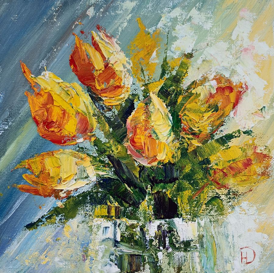 Ярко-жёлтые тюльпаны с соблазнительным красным бочком пылают на холсте, подобно маленьким факелам. Их сияние завораживает, передавая неукротимую силу пробуждающейся природы. Фон мастерски имитирует открытое окно с лёгкой, развевающейся шторкой, через которую врывается солнечный свет. Блики играют на лепестках и листьях, создавая эффект живой динамики и объёма.